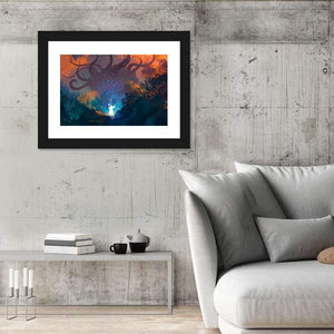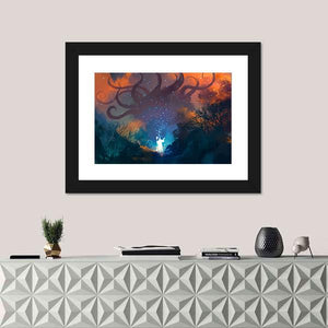 Summoning Ghostly Demon Canvas Wall Art depicts a silhouetted, glowing figure calling a spectral presence among winding tentacles and gnarled trees beneath a star-speckled night sky. The surreal digital scene—deep blues, black, with accents of orange and green—feels mysterious, ethereal, and slightly ominous. It works well in modern or fantasy-themed rooms that favor moody, atmospheric pieces.