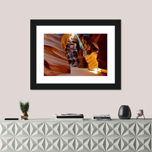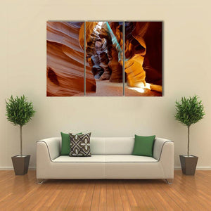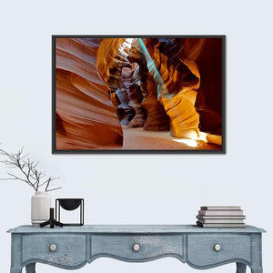 This canvas artwork captures a serene slot canyon illuminated by sunbeams. The smooth, flowing rock textures and warm palette of orange, brown, blue, and yellow create an awe-inspiring landscape that brings the beauty of nature indoors.