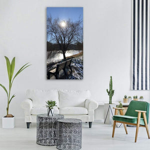 Sun Reflection On Lake In Winter depicts a quiet winter lakeside with a bare tree, a bench, snow, and the sun shimmering on the water. The realistic scene uses blues, browns, whites, and a touch of green to create a serene, peaceful mood. A natural fit for room decor in a modern living room or a calm reading nook.