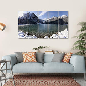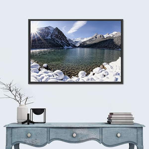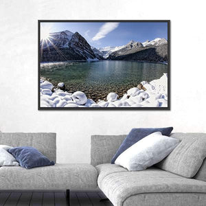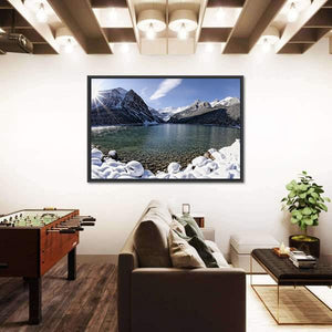 This canvas wall art captures the serene beauty of Lake Louise, framed by majestic snowy mountains. The low perspective and wide-angle view highlight the clear water reflecting the sunburst effect, creating a crisp atmosphere that invites tranquility into your space.