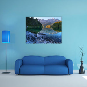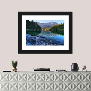 This landscape art captures a serene moment at a mountain lake, framed by majestic jagged mountains and reflecting pine trees. Its calming palette of blues and greens creates a tranquil ambiance, making it a wonderful addition to any nature-inspired decor.