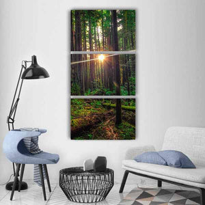 This vertical artwork captures the serene beauty of a redwood forest, where sunlight streams through the trees, illuminating the lush undergrowth and textured bark. The combination of greens, browns, and golden hues creates a peaceful atmosphere that invites awe and reflection.