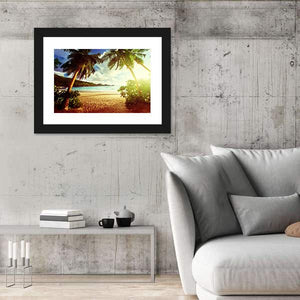 Capture the tranquility of a sunny day at the beach with this canvas print featuring palm trees and the ocean. The composition showcases vibrant hues of blue, green, and yellow, evoking a peaceful and tropical atmosphere suitable for any space.