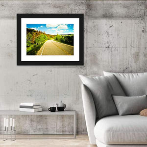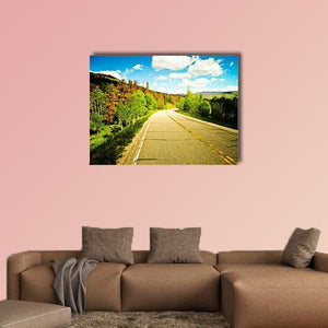 A paved road with yellow center lines leads through deciduous trees wearing autumn colors, toward distant mountains under a blue sky with fluffy white clouds. The vibrant, natural palette of greens, blues, yellows, and browns creates a serene, adventurous mood that fits modern living rooms and hallways as calming wall decor.