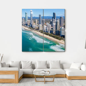 Capture the vibrant allure of the Gold Coast with this stunning canvas wall art. Featuring an aerial perspective of the beach and high-rise buildings against a backdrop of foamy waves and a clear blue sky, it brings a bright, airy atmosphere to your space.