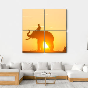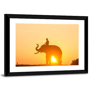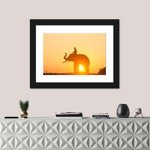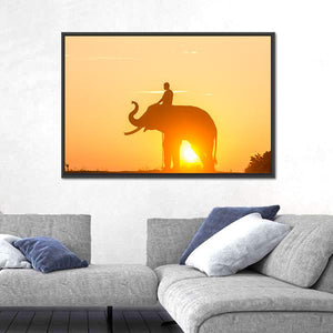 This canvas art depicts a majestic Thai elephant silhouetted against a serene sunset. The warm palette of orange, yellow, and brown evokes a tranquil atmosphere, making it a perfect addition to any room seeking a touch of nature's beauty.