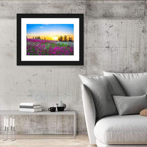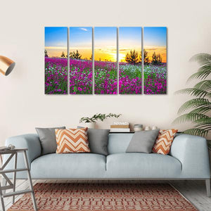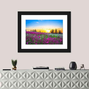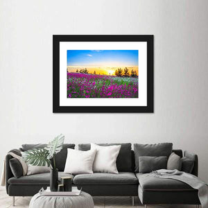 Experience the beauty of nature with this vibrant canvas art featuring a field of flowers under a serene sunset sky. The lush purple and white flowers in the foreground create a peaceful atmosphere, making it a delightful addition to any space.