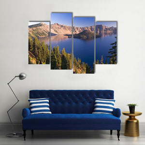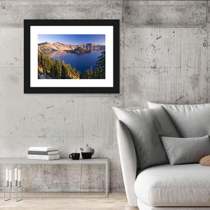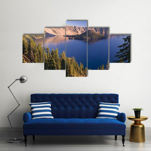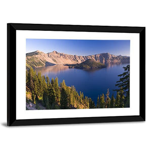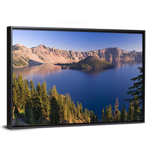 This landscape canvas wall art captures the serene beauty of Crater Lake at sunrise. Featuring a tranquil lake surrounded by rugged mountains and a forested island, it brings a touch of nature's majesty into your space.