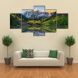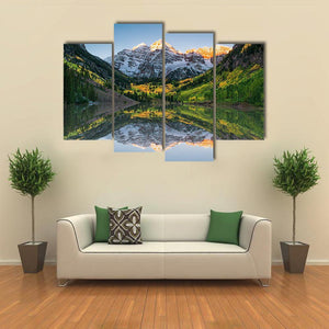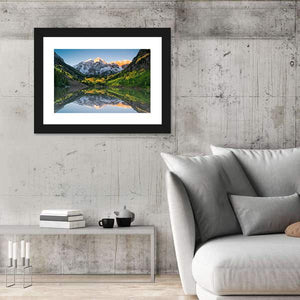 This landscape artwork captures the serene beauty of snow-capped mountains reflected in Maroon Bells Lake. Surrounded by fall foliage and pine trees, it brings a tranquil vibe to any space.