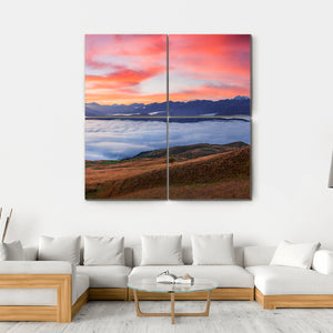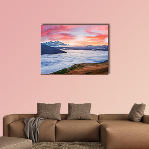 This landscape artwork captures the breathtaking sunrise at Mt Tetnuld, showcasing majestic snow-capped mountains surrounded by a sea of clouds. The vibrant palette of pink, orange, and blue evokes a serene and awe-inspiring atmosphere, making it an ideal addition to your wall decor.