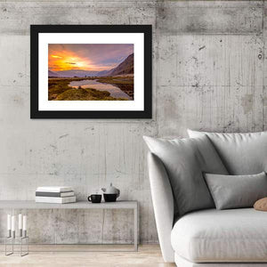 Sunrise At Nubra Valley shows a mountain range and river beneath a dramatic, colorful sky, with orange and purple tones reflected in the water. The realistic landscape uses a rule-of-thirds composition for a serene yet vibrant mood, suited to modern room decor and nature-themed spaces.