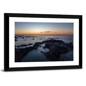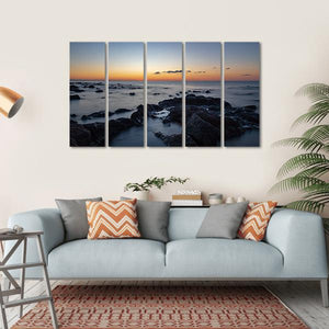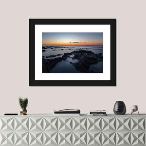Capture the serene beauty of ocean rocks at Palmasera Beach with this tranquil canvas wall art. The soothing palette of blue, orange, and gray evokes peaceful mornings as the sun rises. It's a modern piece that brings a touch of nature into your home, fitting seamlessly into any room decor.