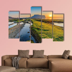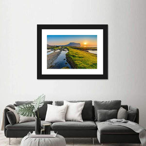 Sunrise At Seongsan Ilchulbong depicts a coastal landscape with mossy green rock formations, grassy foreground, and the sun over the ocean. The realistic blue, green and orange palette creates a serene, tranquil mood that suits modern living rooms or bedrooms.
