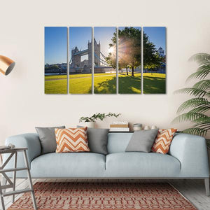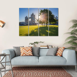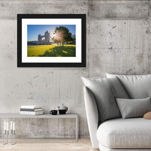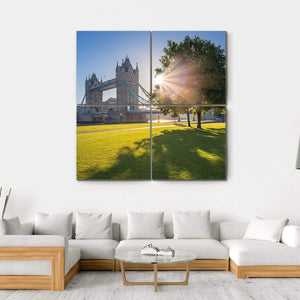 Experience the serene beauty of Tower Bridge bathed in morning light. This piece captures a peaceful cityscape featuring the iconic bridge, a flowing river, and lush trees under a sunny sky. It brings a touch of London elegance to any space.