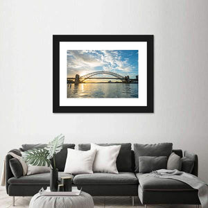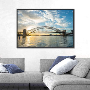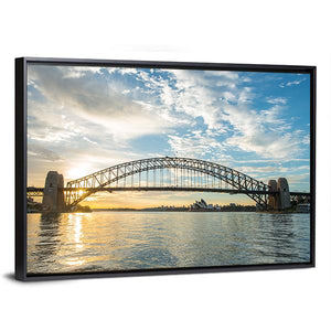 This photographic canvas shows the Sydney Harbor Bridge and Opera House in a wide landscape, with blue and gold light reflecting on calm water. The realistic image feels serene and majestic and works well in modern living rooms, entryways, or coastal-inspired room decor.