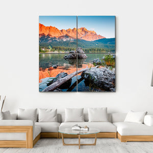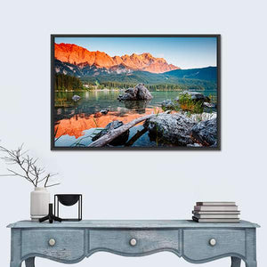 This beautiful canvas features the serene landscape of Lake Eibsee at sunrise, showcasing a majestic mountain range and reflections in calm waters. The rich palette of orange, green, and blue creates a peaceful atmosphere, making it an inviting addition to any nature lover's wall décor.