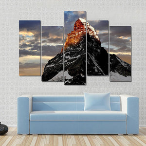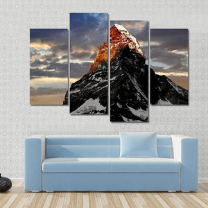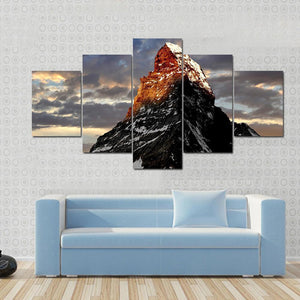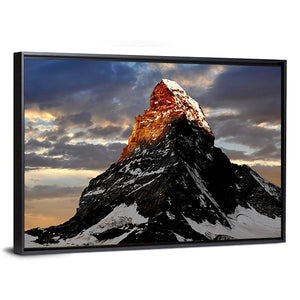 This majestic artwork captures the snow-capped Matterhorn bathed in sunrise light, with dramatic clouds framing the peak. The serene palette of blue, white, and orange evokes a sense of awe, making it a stunning addition to any nature-themed décor.