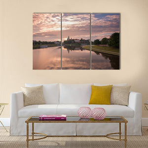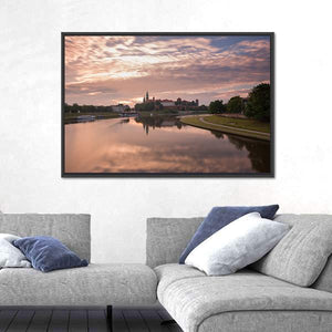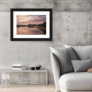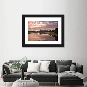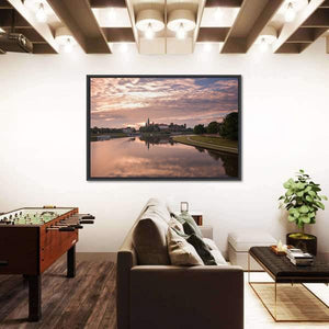 Serene, dreamy landscape of a river and city at sunrise, rendered in a realistic style with a castle’s spires, trees, and dramatic clouds. Calm water mirrors the pink, orange and blue sky to create a peaceful, reflective scene. Suits living rooms or bedrooms and pairs naturally with modern, nature-inspired decor.