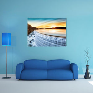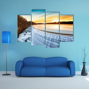 Sunrise Over Croton Dam captures the dam and long-exposure waterfall beneath warm sunrise colors, creating a serene, tranquil mood with calm lake reflections. The photorealistic, modern landscape follows a rule-of-thirds composition and a blue‑orange‑yellow palette to convey a majestic, peaceful scene. It fits modern home décor and nature-focused room decor.