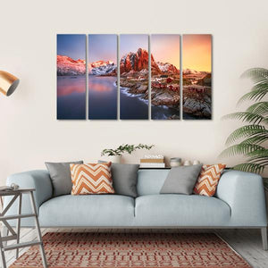 This canvas wall art captures the tranquil beauty of Hamnoy, a mountain village in Norway. Featuring snowy mountains and charming red houses bathed in the warm hues of sunrise, it evokes a scenic and dramatic atmosphere that suits a variety of spaces.