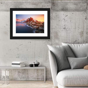 This canvas captures sunrise over Hamnoy in the Lofoten Islands, showing a mountain village beside a rocky shoreline with small red buildings, snow-capped peaks and calm water. Rendered in realistic, vibrant reds, oranges, blues, whites and browns and composed using the rule of thirds, it carries a serene, picturesque mood that suits modern or nature-inspired rooms.