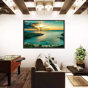 Experience the vibrant serenity of sunrise over Hanauma Bay in Hawaii. This stunning canvas captures the coastline and tropical foliage, with sunrays breaking through the clouds and illuminating clear turquoise water. Perfect for bringing a touch of paradise to your space.