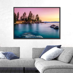 This canvas art beautifully captures a serene sunrise over Lake Tahoe, showcasing the tranquil interplay of pink and blue hues across the sky. The scene features clear water, smooth rocks, and graceful pine trees, making it a refreshing addition to any nature-inspired decor.