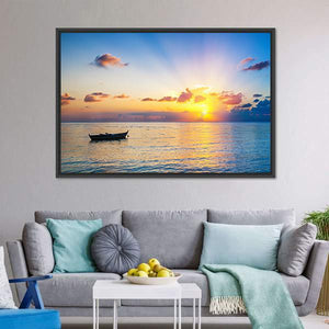 A photorealistic sunrise over the ocean, with soft clouds and a single small boat floating on calm water in blues, oranges, yellows, and pinks. The scene feels serene and peaceful, making it a good fit for modern living rooms or coastal-themed spaces that favor nature-inspired wall art.