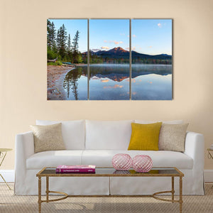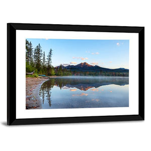 Sunrise Over Pyramid Mountain And Edith Lake shows a mountain range beside Edith Lake with trees and a calm, mirror-like reflection. Soft blues, greens and warm orange wash the peaks and hint at mist on the water, creating a serene, peaceful mood. Suited to home wall decor and modern interiors that favor nature scenes.