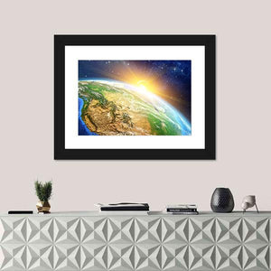 Sunrise Over the Earth Canvas Art shows Earth from space as the sun bursts over the horizon and North America comes into view against a field of stars. The photorealistic image uses blue, green, brown and warm yellow to evoke a serene, awe-inspiring sense of scale. It suits modern interiors and room decor that favor nature- or space-inspired artwork.
