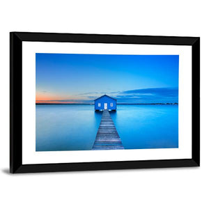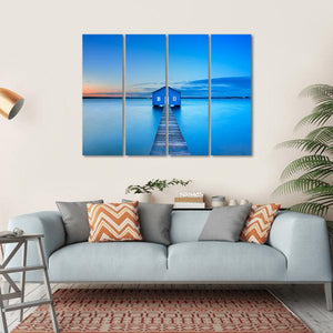 Capturing the serene beauty of Matilda Bay, this canvas features a charming blue boat house and a wooden pier set against calm waters. The tranquil hues of blue, teal, and orange create a peaceful atmosphere, making it a beautiful addition to any modern space.
