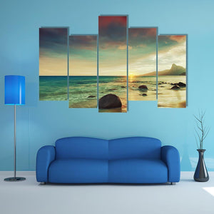 Sunrise Over The Sea Con Dao presents a realistic seascape of ocean and beach with large dark rocks in the foreground and dramatic red and orange clouds along the horizon. The piece reads as both serene and dramatic, and works well as coastal room decor in modern living rooms or bedrooms.