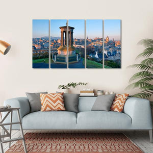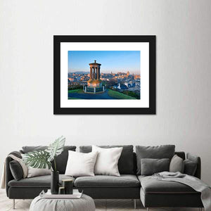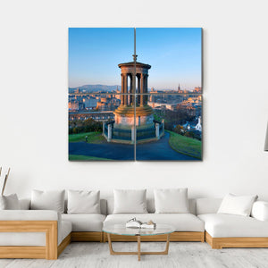 This canvas art captures the majestic skyline of Edinburgh from the vantage point of Calton Hill. With its serene blend of blue, brown, and green hues, it features a classical monument framed by urban buildings and a gently sloping hill. This detailed artwork brings a historic charm to any space.