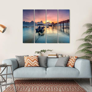 This canvas art captures a tranquil scene of a boat tethered to a stone jetty at sunrise. The serene palette of purple, orange, and blue evokes a peaceful atmosphere, perfect for any nature lover's space.
