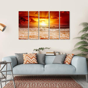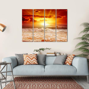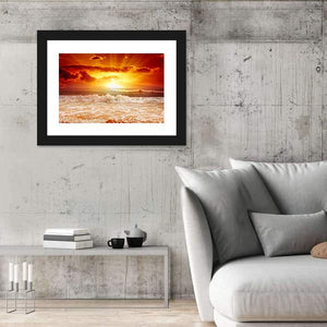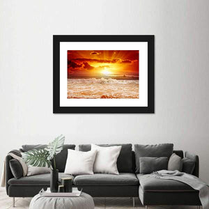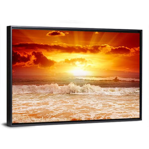 This canvas features a breathtaking ocean sunset with vibrant rays of orange and red illuminating the clouds. The dramatic yet serene scene captures foamy waves, making it a striking addition to any wall decor.