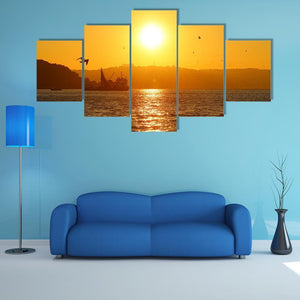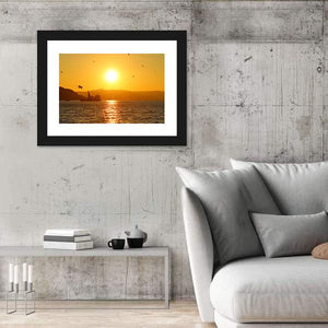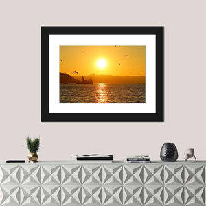 A photorealistic seascape showing a silhouetted fishing boat and gulls in flight against a warm orange-yellow sunset. Composed using the rule of thirds, the scene creates a serene, peaceful mood that suits living rooms and bedrooms and pairs with modern home decor.