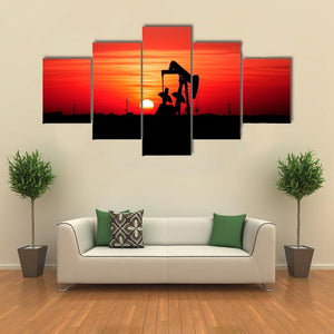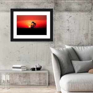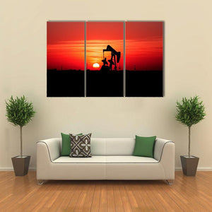 This landscape canvas shows an oil pumpjack silhouetted against a red-orange sunset, with small figures adding scale and story. The rule-of-thirds composition creates a dramatic, industrial yet serene dusk scene. It fits well in modern or industrial rooms as bold wall decor.