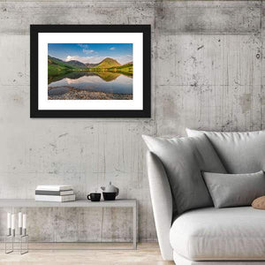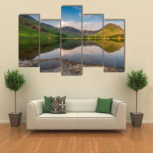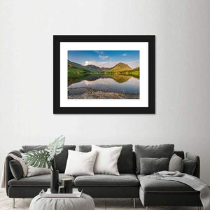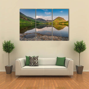 A photorealistic landscape of mountains and a calm lake at sunset, with a rocky shoreline and cloud-filled sky that reflects on still water. The piece feels serene and natural, with a blue‑green palette that suits modern or nature‑inspired rooms.