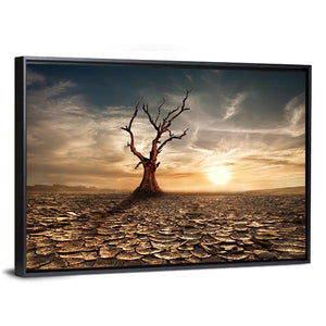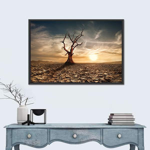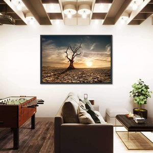 This canvas wall art captures a dramatic sunset over a desolate desert landscape, featuring a lone dead tree casting a long shadow on the cracked earth. The warm palette of browns and oranges, accented with cool blues, creates a striking scene that brings the arid beauty of nature into your home.