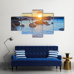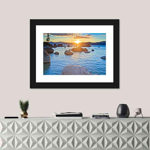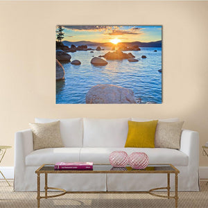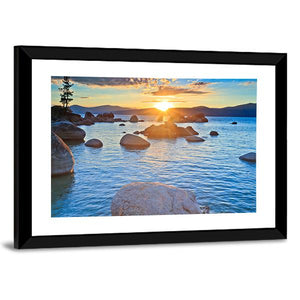 Sunset At Lake Tahoe depicts a photorealistic lakeside scene with the sun setting over the horizon, rays bursting through clouds, and large boulders leading into calm, clear water. A lone tree on the left bank and distant mountains create depth and a warm, peaceful mood, making it a natural fit for house or modern room decor.