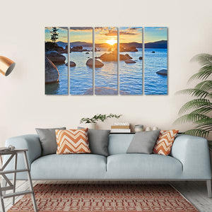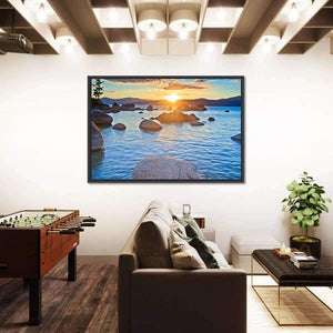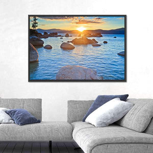 This canvas art captures a serene sunset over Lake Tahoe, featuring large boulders in the water and a lone tree to the left. The warm palette of blue, orange, and yellow evokes a peaceful atmosphere, making it a fitting addition to any nature-inspired décor.
