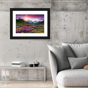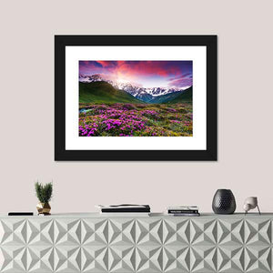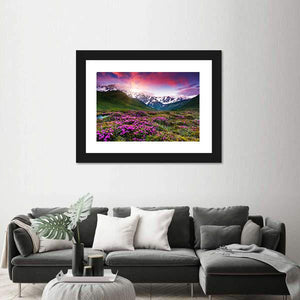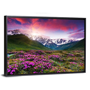 This canvas art depicts a majestic mountain range in Georgia at sunset. Soft hues of purple, pink, and blue blend beautifully with a field of wildflowers, creating a serene and vibrant atmosphere.