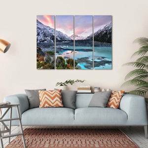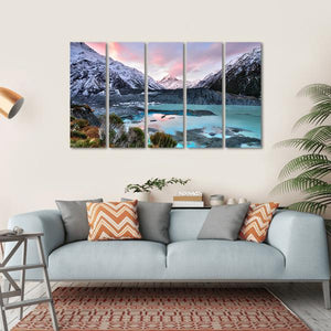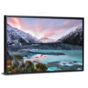 This canvas art captures the serene beauty of snowy mountains and a turquoise lake at Aoraki Mt Cook, adorned with soft pink clouds. The tranquil scene evokes a sense of majesty, making it a perfect addition to any nature-inspired décor.