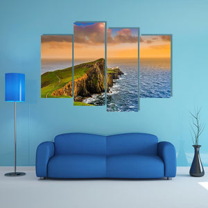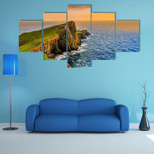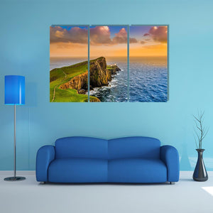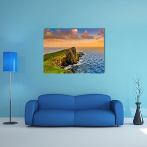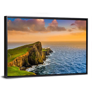 This beautiful canvas depicts the majestic Neist Point Lighthouse against a tranquil sunset. With its serene palette of greens, blues, and oranges, it captures coastal cliffs and the vast ocean, perfect for creating a calming atmosphere in any space.