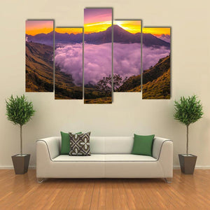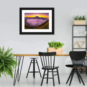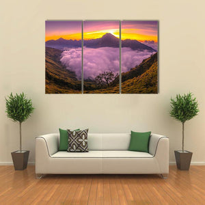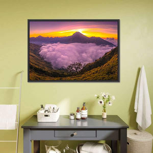 A photorealistic mountain landscape shows thick, fluffy clouds filling a valley as the sun rises behind a peak, creating a serene, majestic, and slightly ethereal mood. Warm purples, oranges, and yellows give the scene a soft glow that suits modern living rooms or bedrooms as wall decor.