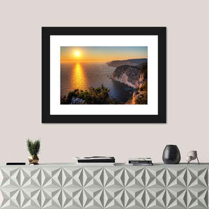 Sunset At The Cliffs Of Keri shows a realistic landscape of ocean and rugged cliffs with the sun setting over the water. A blue, orange and yellow palette creates a serene, tranquil mood. It suits modern or nature-focused rooms and brings a calm coastal touch to living rooms, bedrooms, or entryways.