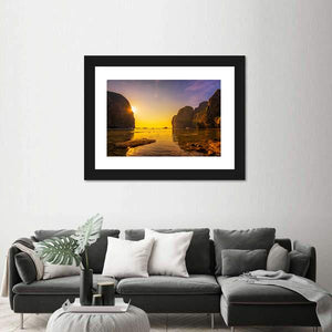 This canvas features a stunning sunset over the ocean, framed by majestic cliffs. With a vibrant palette of yellow, orange, and purple, it brings a serene and tranquil vibe to any space.