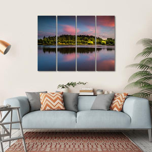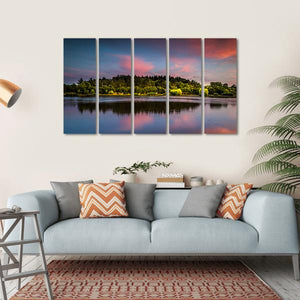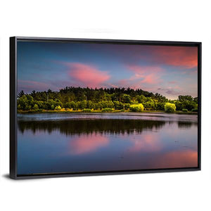 Capture the serene beauty of a tranquil lake at sunset with this elegant canvas art. The striking reflection of the tree line and soft pink clouds blend harmoniously, making it a perfect addition to any nature-inspired decor.