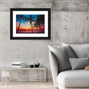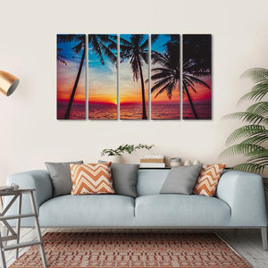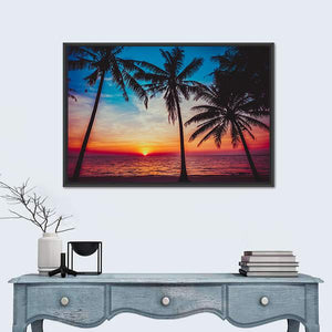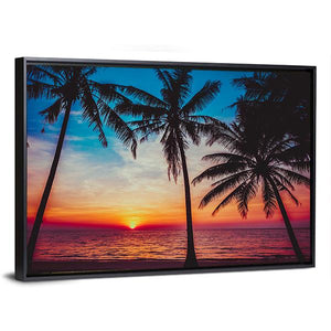 This canvas captures the serene beauty of a tropical beach at sunset, featuring silhouetted palm trees against a vibrant blue, orange, and pink sky. The tranquil scene evokes a sense of peace and escape, making it a lovely addition to any nature-themed decor.