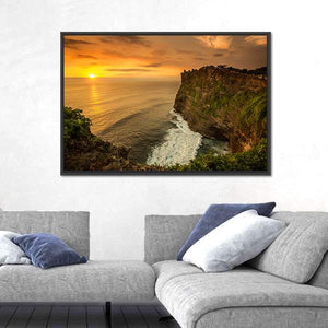 Sunset at Uluwatu Temple in Bali captures the ocean and cliffs under a warm orange-gold sky. Rendered in a realistic landscape style with a high-angle sense of depth and waves crashing against the cliff, this piece brings a serene, majestic mood to home living spaces.